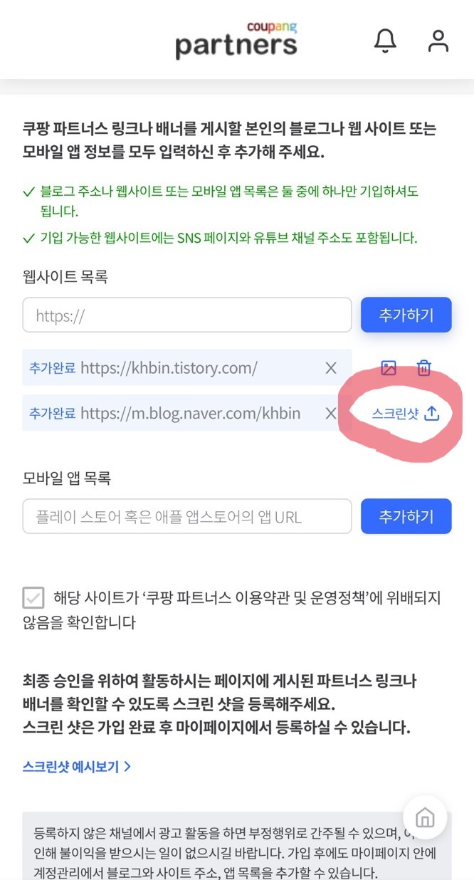 1. 쿠팡 파트너스 클릭 https://partners.coupang.com/# Coupang Partners 쿠팡과 함께 수익을 창출해보세요 partners.coupang.com 2. 회원가입 또는 쿠팡아이디로 로그인 3. 사업자유형, 개인 클릭 4. 연락처와 추천인 입력 추천인: AF3799587 딱히 추천인 없으면 저를 넣어주시면 감사ㅎ 5. 블로그 주소 적기 5. 스크린샷 추가 오른쪽 상단 -> 내정보관리 추가했던 웹사이트 목록 옆의 스크린샷 클릭 -> 이미지 올리기 끝.