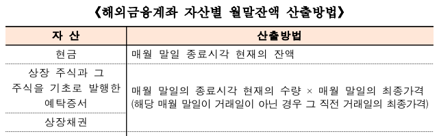 == 국세청 보도자료 요약 == 6월, 해외금융계좌 신고하세요! 6월(6.1.~6.30.)은 해외금융계좌를 신고하는 달입니다. 거주자 및 내국법인은 2022년 중에 보유한 모든 해외금융계좌 내 현금, 주식, 채권, 보험상품, 가상자산 등 잔액을 합산한 금액이 매월 말일 중 어느 하루라도 5억 원을 넘었다면 그 계좌정보를 신고하여야 합니다. 2023년 해외금융계좌 신고 안내 1.신고의무자 (’22년 해외금융계좌 보유자) 거주자 및 내국법인은 2022년에 보유한 모든 해외금융계좌 잔액 합계액이 매월 말일 중 어느 하루라도 5억 원을 초과하였다면 그 계좌정보를 오는 6월 30일까지 신고해야 합니다. 2.신고대상 (해외금융계좌 내 금융자산) 신고의무자는 해외금융회사등과 금융거래 및가상자산거래를 위해 개설한 모든..